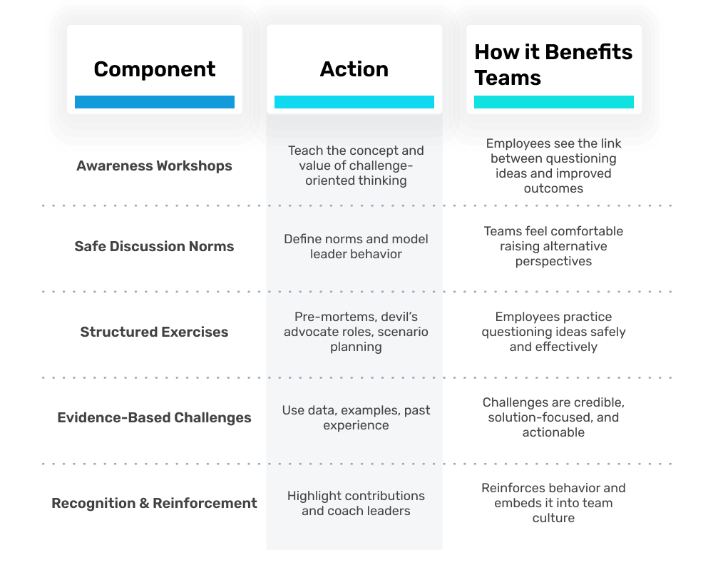 Challenge-oriented thinking improves through practice. Structured exercises create a safe space for employees to experiment with questioning ideas and exploring alternatives.