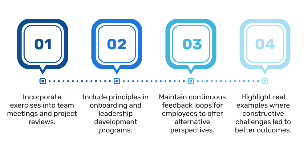 Regularly integrating these exercises into meetings or workshops allows employees to gain hands-on experience and gradually build confidence in offering constructive challenges.