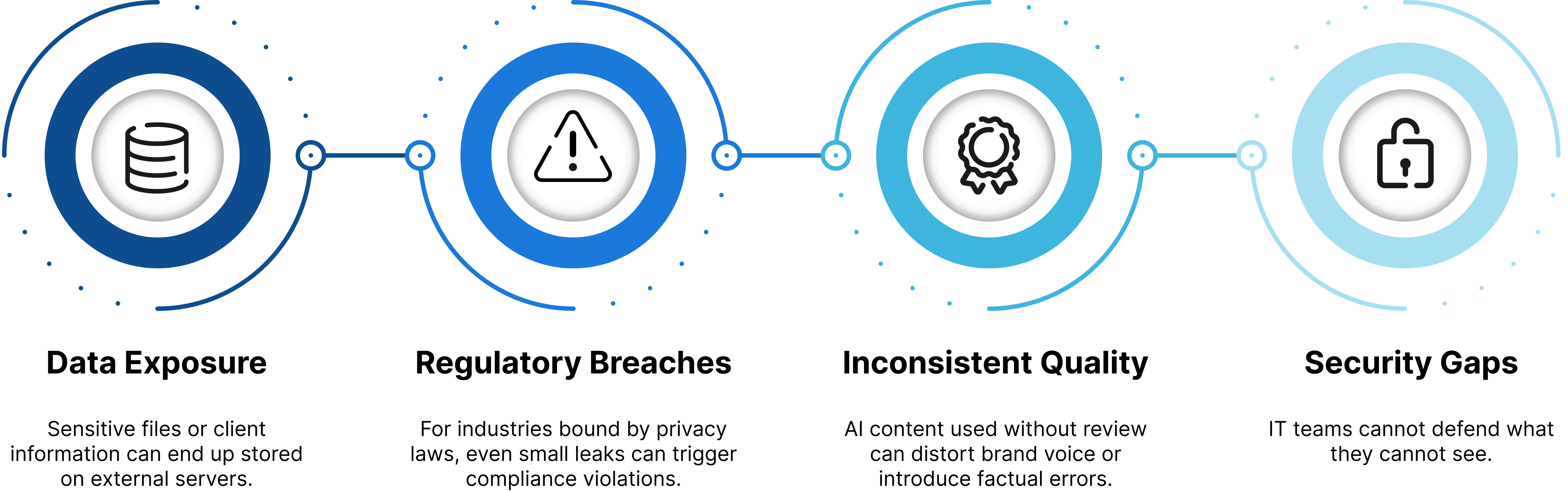 Many teams still do not have access to organization-approved AI tools. Those that exist may be limited or confusing to use. Employees see how much AI can help but feel trapped by slow internal processes. When the need for productivity meets the absence of clear options, personal accounts and browser tabs fill the gap.