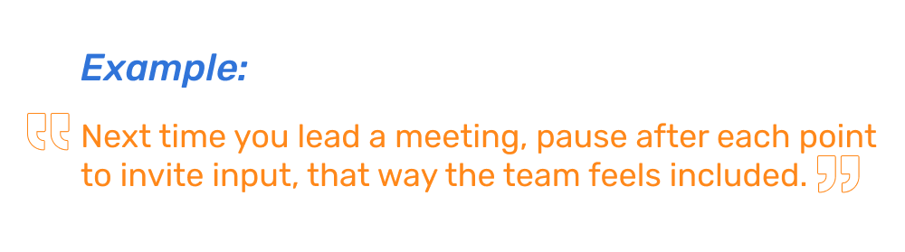 Example: “The report shows you spoke less than 5% of the time in the last five team meetings. What’s holding you back?”