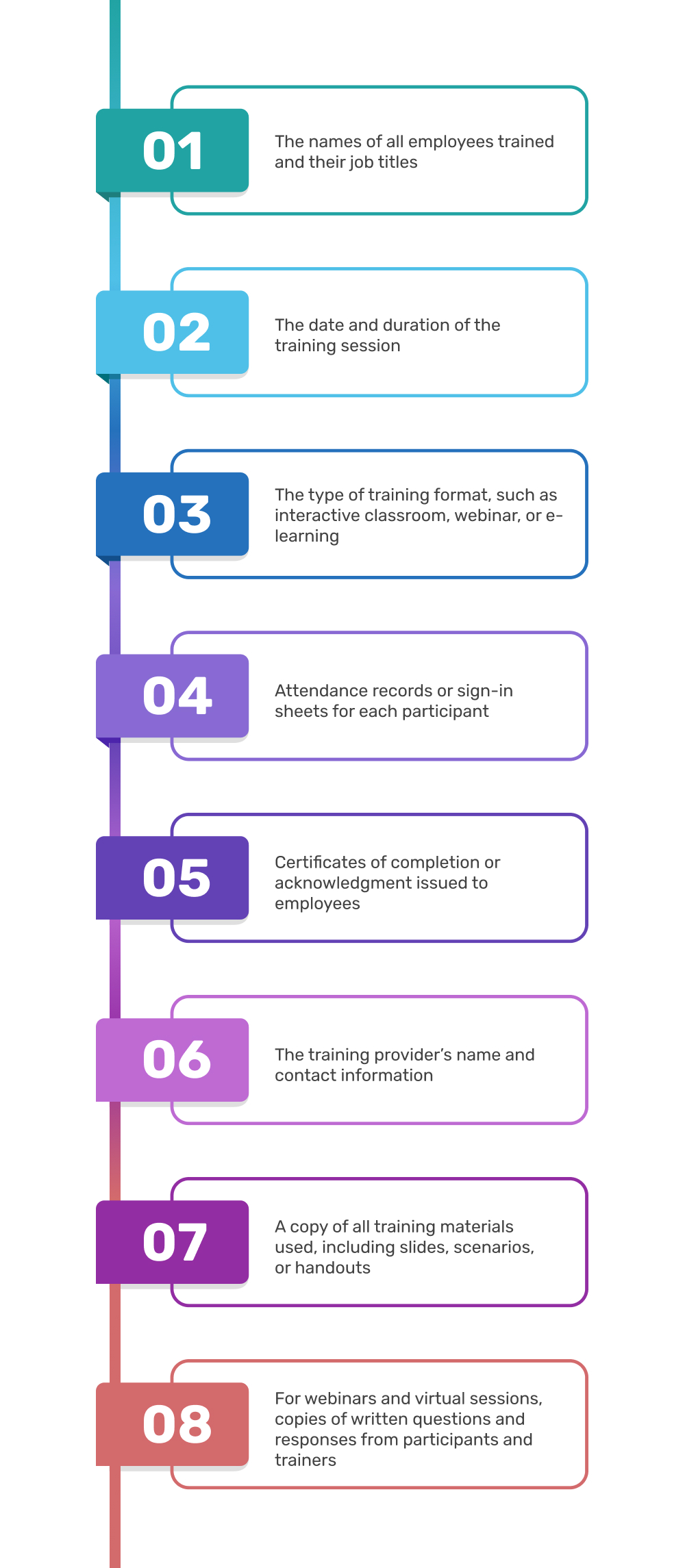 - Audit Readiness: Regulators can request training records during routine compliance checks or in response to complaints. Having organized documentation avoids last-minute scrambling